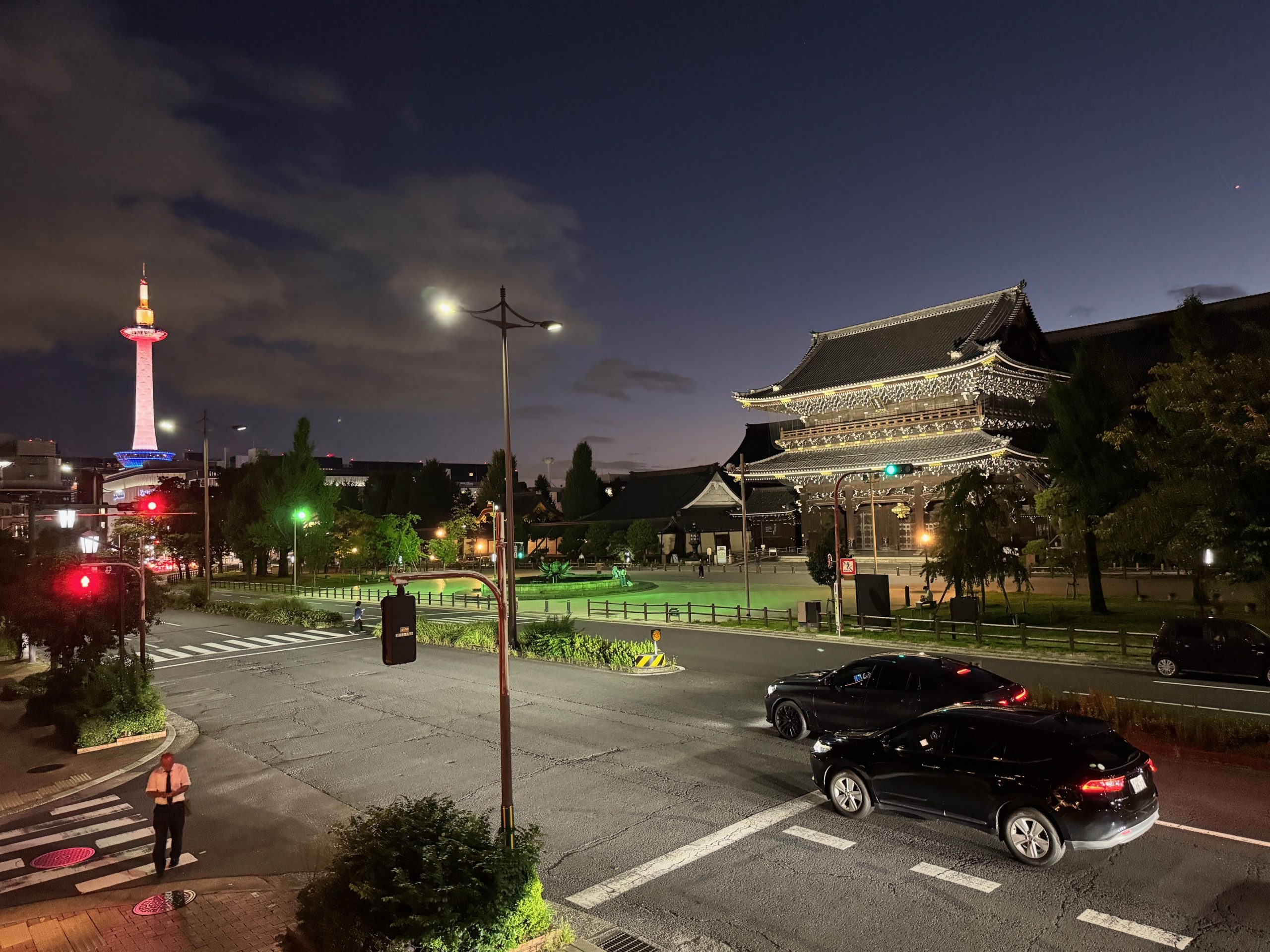 it sits directly in front of the main hall of Higashi Honganji Temple.
